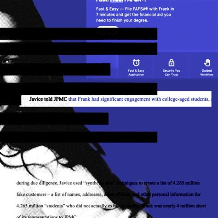However, Javice is being sued for allegedly misleading JPMorgan Chase into purchasing the firm for $175 million little over a year after Frank was acquired by the bank.