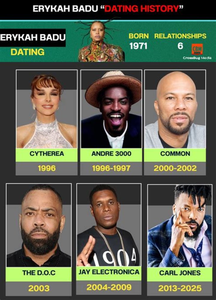 The American 52-year-old r&b singer is dating Carl Jones now, according to our records. Erykah Badu remains relatively quiet when it comes to sharing her personal life and makes it a point to stay out of the public eye.